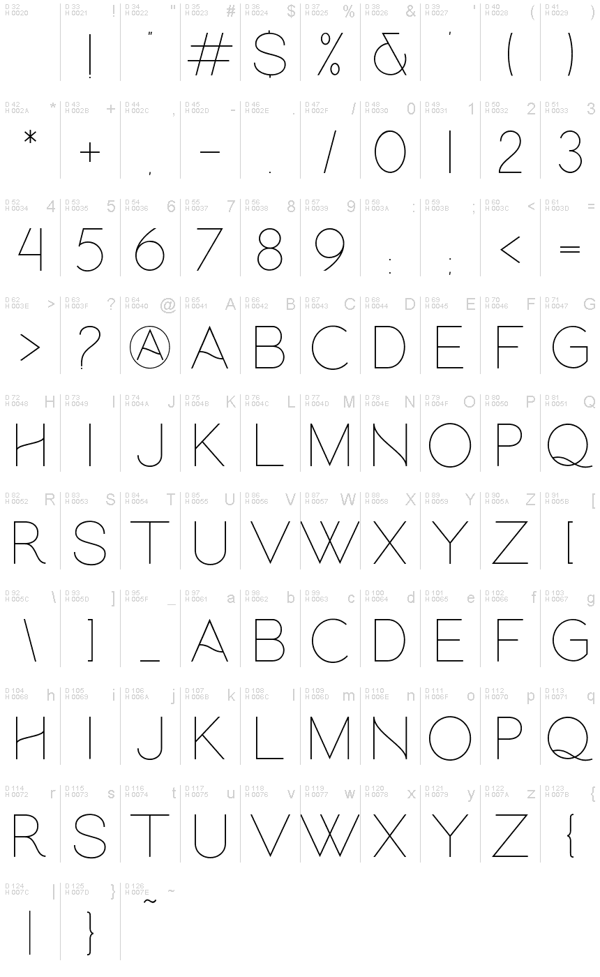 Prosím, použijte roletové menu ke shlédnutí různých tabulek znaků obsažených v tomto písmu.